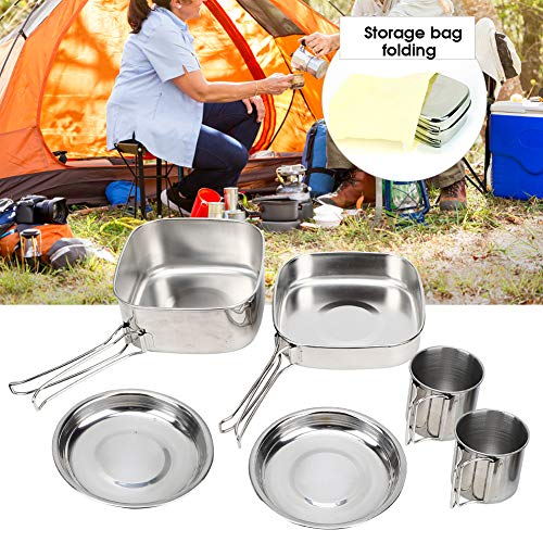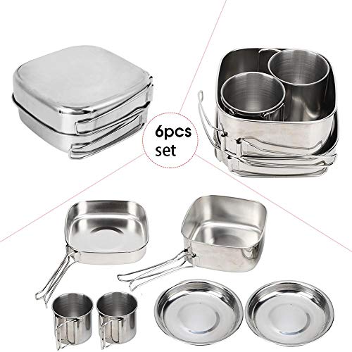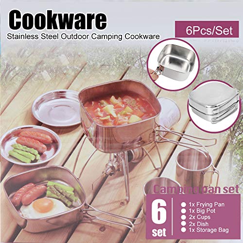 Roestvrijstalen materiaal, niet gemakkelijk te roesten, opvouwbare handgreep van de reinigingspan, gemakkelijk mee te nemen, geen ruimte in beslag te nemen, multifunctionele pot, geschikt voor verschillende picknickgelegenheden, 6-delige set is gemakkelijk te dragen en op te slaan.