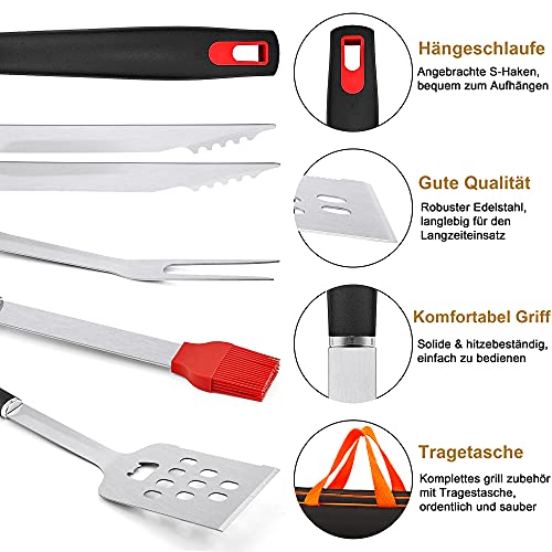 【Grillbestek met lange greep】 Extra lange handgrepen zijn hittebestendig en beschermen je tegen brandwonden door hoge temperaturen of spuitolie. De antislip handgreep is goed verbonden met zwart rubber en houdt comfortabel. Aan elke handgreep bevindt zich een groot ophangoogje, eenvoudig op te hangen grillgereedschap in de keuken