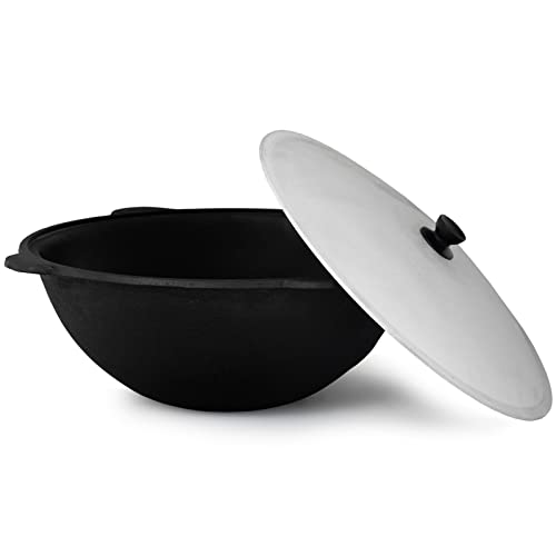Specification: NAMANGAN Kazan Zbeekse braadpan van gietijzer, 10 l (ronde bodem), Kazan Oezbeekisch, Cast Iron KESSEL Uzbek, camping Usbek Asia Wok, pan met aluminium deksel